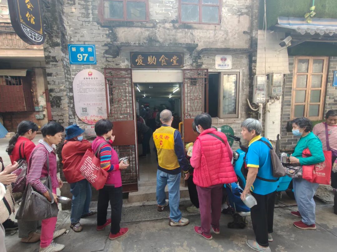 临近晌午,日头斜斜晒在屋檐,位于禅城区新安街的爱助食堂的铁闸门刚拉开半扇,门口就攒满了密密的人头,不少食客都是这里的常客。“味道好,分量足,天天来这儿吃饭,就像回家一样。”77岁的独居老人禧伯伯熟练地找到座位,和街坊唠起了家常。