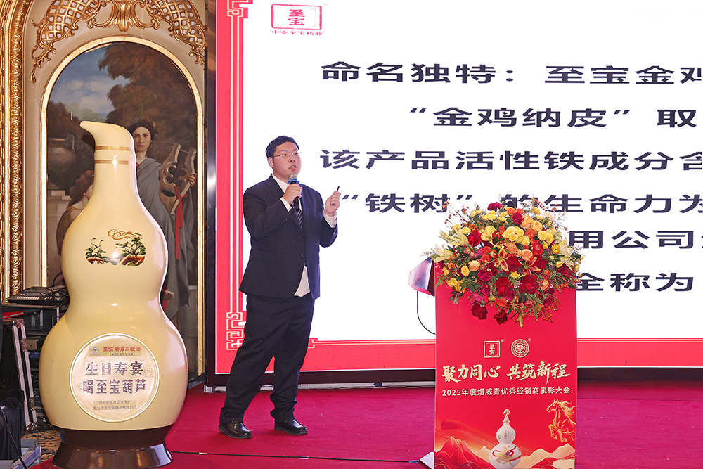 在备受期待的品牌赋能环节,烟台中亚至宝药业有限公司培训部总监倪晓忠带来《动物药与植物药完美融合的保健酒》主题分享,深度解读了保健酒行业发展趋势,以及中亚至宝药业有关产品背后的历史渊源、创新智慧与核心竞争力。随后,烟台中亚至宝药业有限公司培训部金牌讲师李振鹏以《双星辉映:至宝金鸡铁树酒与特质灵芝酒的产品体系与市场价值解析》为题,系统梳理了产品的市场定位与竞争优势,进一步增强了合作伙伴对品牌价值与市场前景的信心。