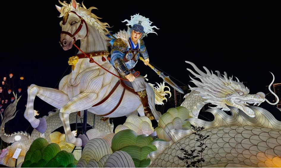 马年主题灯组《神骏出东方》成为园区内的“网红打卡点”,巨型神骏的蹄子灵动摆动,仿佛正要踏锦而出;《子龙攻坚尤可效》灯组造型精致,铠甲纹路清晰可见,尽显“常胜将军”赵子龙白袍银枪的英雄气概;《人面桃花相映红》灯组将崔护的经典诗句具象化,桃花树下,巨大的桃花仙子不仅造型绝美,还会灵动地“眨眼”,与你温柔互动,让千年的诗意变得触手可及。