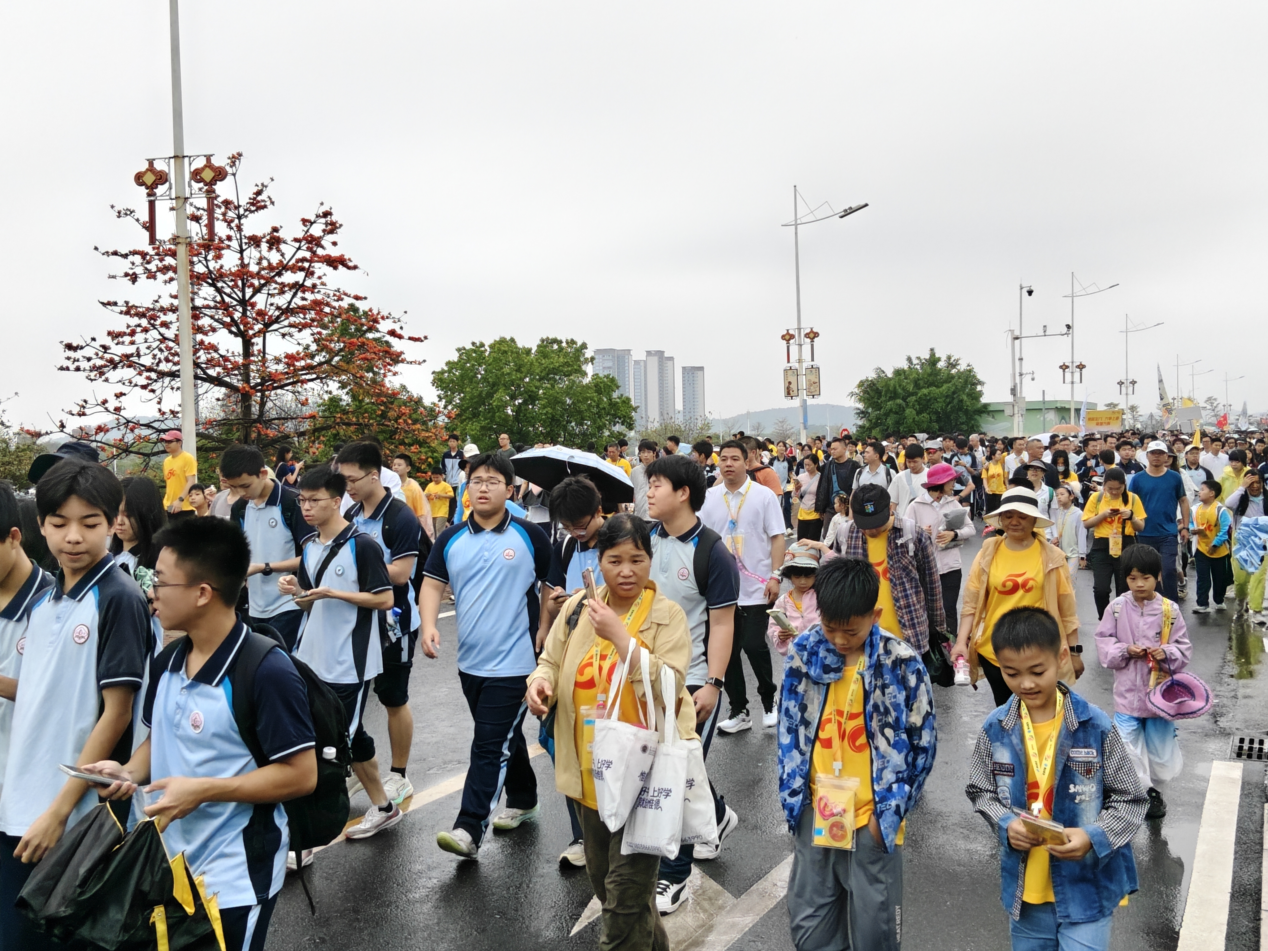 佛山职业技术学院组织近200名师生踊跃参与,学校领导带队参与,师生无惧风雨、步履坚定,展现出一马当先、奋勇向前的昂扬风貌;佛山市高级中学超千名高一学子身着整齐校服,在木棉树、滨江绿道等打卡点驻足合影,班主任与家长志愿者紧随队伍,用镜头记录少年们的灿烂笑颜;佛山二中千余名师生及家长,在烟雨朦胧中丈量家乡美景,用陪伴书写成长温情;澜石中学参与徒步的师生,多数人已是第二次参与,“每年都走远一点、进步一点!”的话语,彰显出坚韧向上的青春风采。